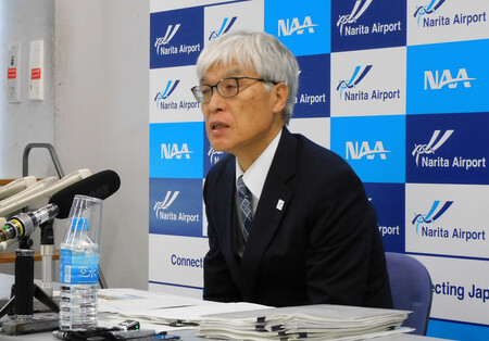 〔写真説明〕記者会見で共生バンクとの契約を説明する成田国際空港会社の藤井直樹社長=27日午前、成田空港