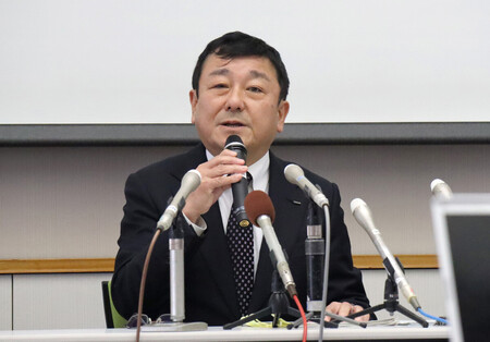 〔写真説明〕記者会見する東京電力柏崎刈羽原発の稲垣武之所長=27日午前、新潟県刈羽村