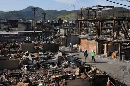 大分市佐賀関で発生した大規模火災で、市は28日、飛び火したとみられる沖合の無人島を除いて再燃の恐れがなくなったとして「鎮火」を宣言した。一方、現場調査などの結果、焼損した建物は計182棟に増えた。 無人島も延焼の恐れが低い「鎮圧状態」になったが、同日の災害対策本部会議で足立信也市長は「消防隊による警戒活動を1週間程度継続したい」と述べた。 〔写真説明〕大規模火災の現場=27日、大分市佐賀関