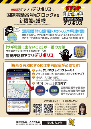 〔写真説明〕防犯アプリ「デジポリス」に搭載された国際電話ブロック機能について案内するチラシ(警視庁提供)