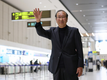 〔写真説明〕ノーベル賞授賞式が行われるスウェーデンへ向け出発する京都大の北川進特別教授=3日午後、伊丹空港