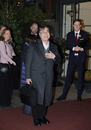 〔写真説明〕ノーベル賞授賞式と関連行事出席のためストックホルムに到着し、ホテルに入る大阪大の坂口志文特任教授(中央)=5日