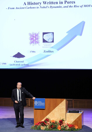〔写真説明〕記念講演するノーベル化学賞に選ばれた京都大の北川進特別教授=8日、ストックホルム