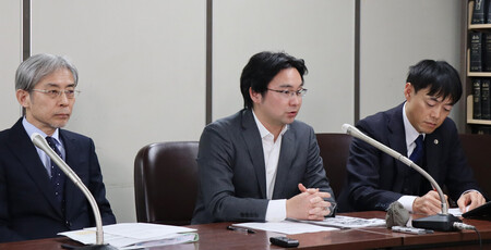 〔写真説明〕世界平和統一家庭連合(旧統一教会)の田中富広会長が辞任を表明したことについて、記者会見する全国霊感商法対策弁護士連絡会の木村壮弁護士(中央)ら=9日午後、東京都千代田区