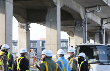 〔写真説明〕地震の影響でコンクリートがはがれた八戸線の高架橋の支柱=10日、青森県八戸市