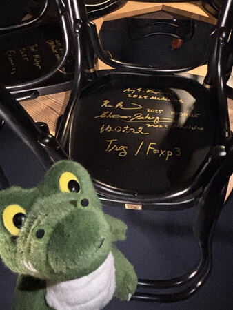 〔写真説明〕ストックホルムのノーベル博物館で大阪大の坂口志文特任教授がサインした椅子と写る「ワニ博士」(阪大の公式Xより)