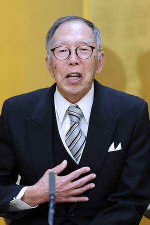 〔写真説明〕「歌会始の儀」を終え、記者会見する入選者の室木正武さん=14日午後、宮内庁
