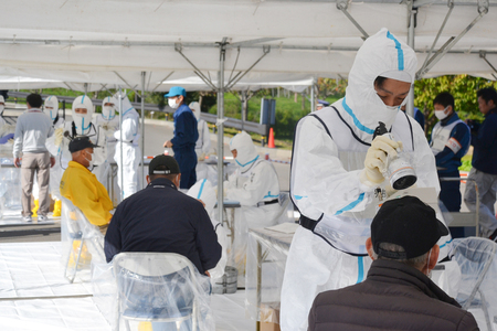 〔写真説明〕原発事故の避難訓練で、スクリーニングを受ける避難者=2019年11月、新潟県燕市