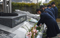〔写真説明〕えひめ丸事故の追悼式で献花する愛媛県立宇和島水産高校の生徒=10日午前、同県宇和島市
