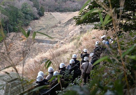 盛り土の崩落起点である逢初川最上流部付近と被害が大きかったとされる下流部の2カ所を2時間弱かけて視察した。原告や被告側代理人らも参加した。