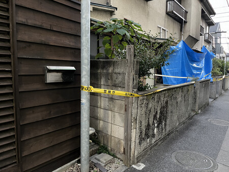 〔写真説明〕火事のあった民家(手前)とアパート(奥)。周辺には焦げ臭いにおいが漂っていた=2025年11月28日、東京都品川区