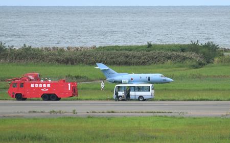 〔写真説明〕新潟空港の滑走路から外れて停止した航空自衛隊のU125A救難捜索機(右奥)=2025年9月、新潟市東区