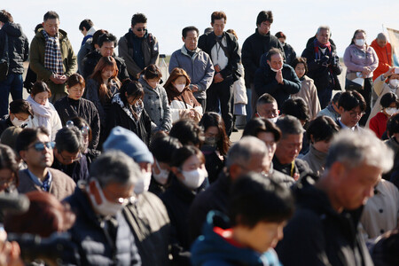 〔写真説明〕東日本大震災の発生時刻に黙とうする人たち=11日午後2時46分、宮城県名取市
