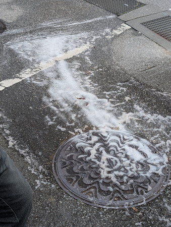 〔写真説明〕マンホールから発生した泡=1月29日、沖縄県宜野湾市(与那城千恵美さん提供)