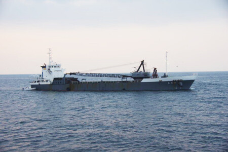 〔写真説明〕青森県三沢漁港沖で漁船と衝突した貨物船=17日午前(八戸海上保安部提供)