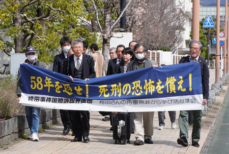 〔写真説明〕袴田巌さんの名誉毀損(きそん)訴訟で、静岡地裁に向かう弁護団=26日午前、静岡市
