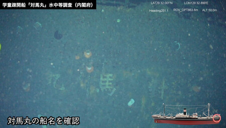 政府は26日、第2次大戦中に米軍の潜水艦に撃沈された沖縄の学童疎開船「対馬丸」の船体再調査結果を公表した。無人探査機が周回して撮影したところ、左舷中央付近に魚雷を受けたとみられる穴を確認できた。調査映像は内閣府ホームページ(HP)で公開している。 〔写真説明〕政府再調査で確認した対馬丸の船体に記された船名(内閣府提供)