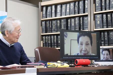 〔写真説明〕オンライン記者会見で再審制度改正に向けたクラウドファンディングを呼び掛ける袴田ひで子さん(右)=3月31日午後、東京都千代田区
