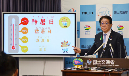 〔写真説明〕最高気温40度以上の日の新名称「酷暑日」を発表する金子恭之国土交通相=17日、東京・霞が関