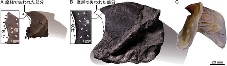 北大の伊庭靖弘准教授らは昨年、化石を含む岩石を薄く研磨してデジタル撮影し、再構成して3次元化する手法を開発。さらに、AIでタコのあごの化石を自動抽出し、表面の傷や摩耗痕なども詳しく調べた。