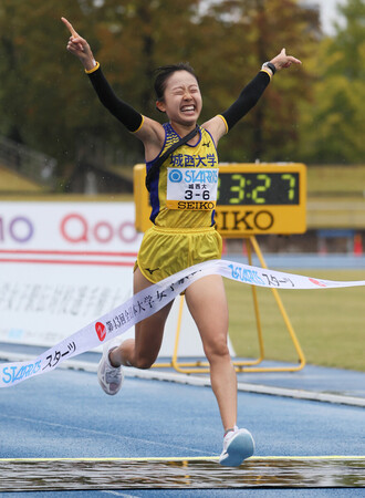 第43回全日本大学女子駅伝対校選手権は26日、弘進ゴムアスリートパーク仙台発着の6区間38キロのコースで行われ、城西大が2時間3分28秒をマークし、2000年以来25年ぶり3度目の優勝を果たした。 16秒差の2位は大東大。3位は名城大だった。 城西大は3位でたすきを受けたアンカーの金子が、区間賞の走りを見せて逆転した。【時事通信社】 〔写真説明〕1位でゴールする城西大の金子陽向=26日、弘進ゴムアスリートパーク仙台