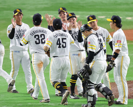〔写真説明〕阪神に勝ち、喜ぶソフトバンクナイン=26日、みずほPayPay