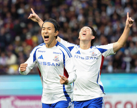 〔写真説明〕後半、ゴールを決めて喜ぶ横浜Mの天野(左)=9日、サンガS