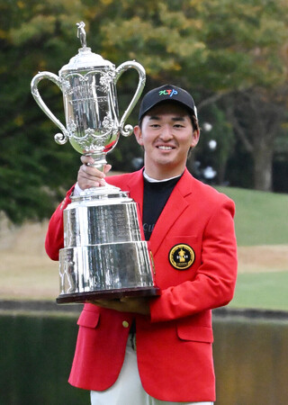 〔写真説明〕優勝トロフィーを手にする金子駆大=16日、静岡・太平洋C御殿場