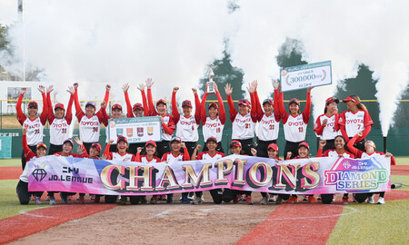 ソフトボール女子のニトリJDリーグは16日、東京・ジャイアンツタウンスタジアムで年間王者を決めるダイヤモンドシリーズの決勝が行われ、トヨタ(西地区1位)がビックカメラ高崎(東地区2位)に4―2で勝ち、3連覇を果たした。 トヨタは三回、石川の2点適時打で先制。五回は山田の2ランで加点し、相手の先発、上野を攻略した。【時事通信社】 〔写真説明〕3連覇を果たしたトヨタ=16日、東京・ジャイアンツタウンスタジアム