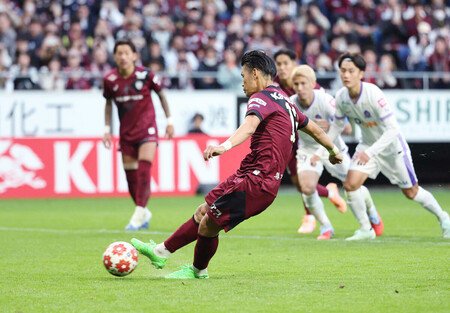 〔写真説明〕後半、PKを決める神戸の佐々木(手前)=16日、パナソニックスタジアム吹田