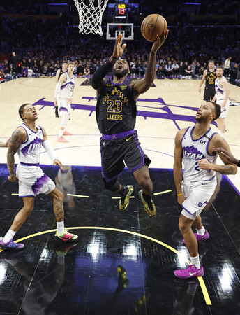 〔写真説明〕ジャズ戦でシュートを放つレーカーズのレブロン・ジェームズ=18日、米ロサンゼルス(AFP時事)