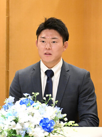 〔写真説明〕プロ野球西武と仮契約を結び、記者会見する上智大の正木悠馬投手=5日、東京都新宿区