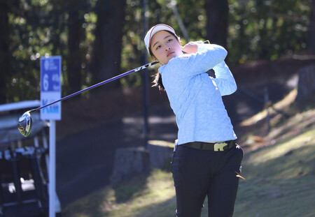 〔写真説明〕6番、ティーショットを放つ呉佳晏=22日、愛媛・エリエールGC松山