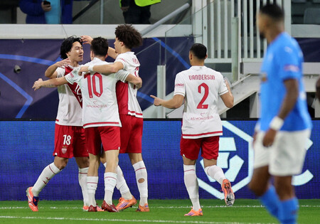 〔写真説明〕先制ゴールを決めて喜ぶモナコの南野(左端)=26日、キプロス・リマソル(ロイター時事)