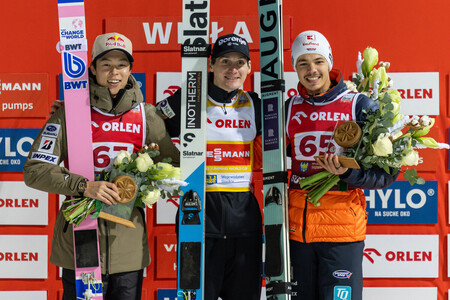 〔写真説明〕ジャンプ男子個人第7戦で2位となり、表彰台に立つ小林陵侑(左)=7日、ポーランド・ビスワ(AFP時事)