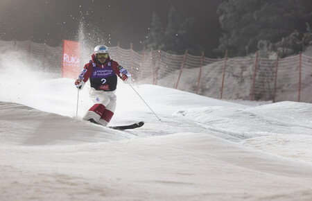 〔写真説明〕W杯モーグルの開幕戦を制した堀島行真の滑り=7日、フィンランド・ルカ(Lehtikuva時事)