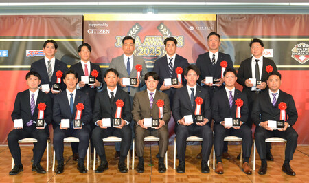 〔写真説明〕社会人野球の表彰式で記念撮影に応じる選手ら=10日、東京都千代田区
