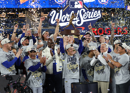 〔写真説明〕ブルージェイズとのワールドシリーズを制し、最優秀選手(MVP)に選ばれ、笑顔でトロフィーを掲げるドジャースの山本由伸(中央)=11月2日、カナダ・トロント