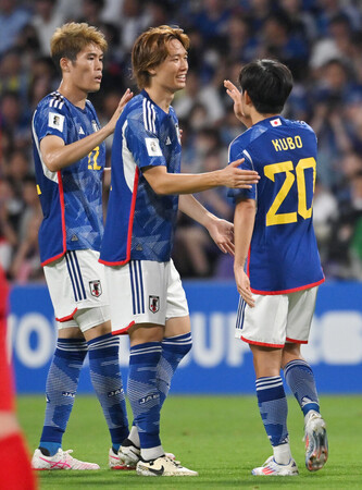 〔写真説明〕W杯アジア2次予選のシリア戦で、久保(右)を祝福する板倉(中央)と冨安=2024年6月、エディオンピースウイング広島