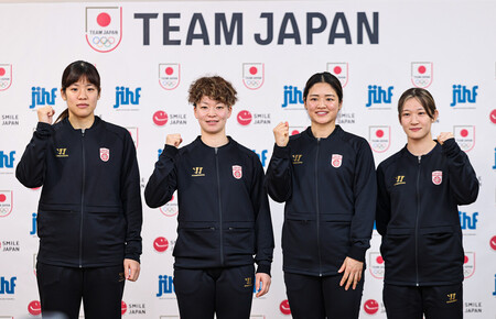 〔写真説明〕ミラノ・コルティナ五輪のアイスホッケー女子日本代表に選ばれた(左から)浮田、小池、細山田、輪島=25日、北海道苫小牧市
