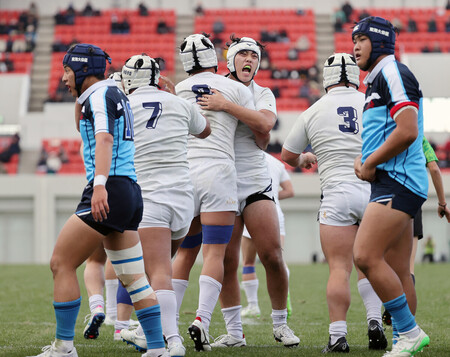 〔写真説明〕後半、トライを決めた土肥(手前)を祝福する京都成章の岡元=3日、大阪・花園ラグビー場
