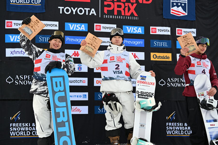 〔写真説明〕W杯ハーフパイプ第4戦で優勝した男子の戸塚優斗(中央)。左は2位で続いた重野秀一郎=9日、米コロラド州アスペン