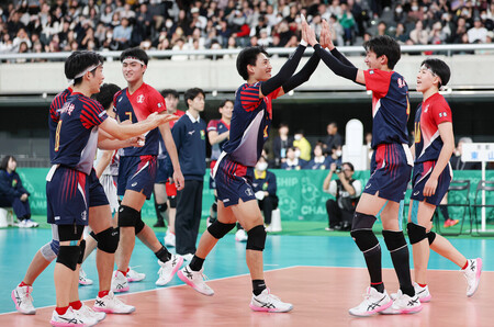〔写真説明〕準決勝を突破し、喜ぶ就実の選手ら=10日、東京体育館