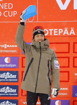 〔写真説明〕ノルディックスキーのワールドカップ(W杯)複合男子で歴代最多の296回目の出場を果たし、記念品を贈呈された渡部暁斗=10日、エストニア・オテパー