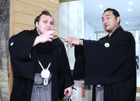 〔写真説明〕大相撲初場所で優勝し、師匠の安治川親方(右)に水をつけてもらう安青錦=25日、東京都江東区