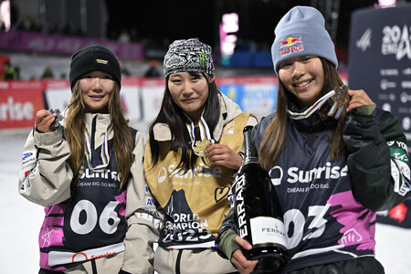 〔写真説明〕スノーボード世界選手権のビッグエア女子で優勝した村瀬心椛(中央)、2位の岩渕麗楽(左)、3位の深田茉莉=2025年3月28日、スイス・サンモリッツ(AFP時事)