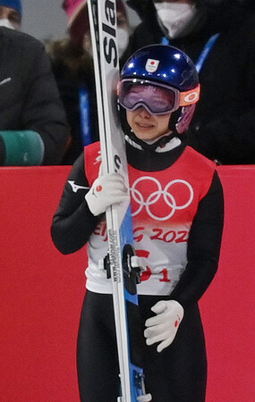 〔写真説明〕ノルディックスキー・ジャンプ混合団体で2回目の飛躍を終え、涙する高梨沙羅=2022年2月、中国・張家口