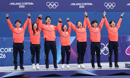 〔写真説明〕フィギュアスケート団体の表彰式に臨む銀メダルの日本チーム=8日、ミラノ郊外