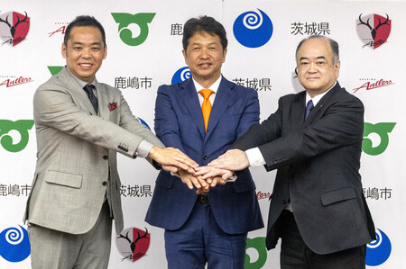 〔写真説明〕新スタジアム建設構想を発表したJ1鹿島の小泉文明社長(左)と茨城県の大井川和彦知事(中央)ら=12日、水戸市