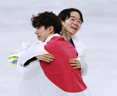 〔写真説明〕表彰式後、抱き合って喜ぶフィギュアスケート男子で銀メダルの鍵山優真(右)と銅メダルの佐藤駿=13日、ミラノ郊外